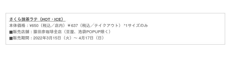 猿田彦珈琲株式会社(本社:渋谷区/代表取締役:大塚朝之)が運営する猿田彦珈琲は、日本の春をイメージした「さくら抹茶ラテ」を、2022年3月15日(火)より期間限定で販売いたします。また同日より、香り華やかな限定のコーヒー豆「春うららブレンド」もリニューアルして登場いたします。