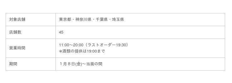 この度、感染拡大状況ならびに政府・自治体からの要請に伴い、関東地区の営業時間を以下のように変更いたしますので、お知らせいたします。
