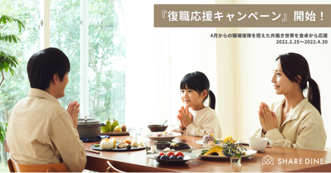 “子どもや家族の食事に丁寧に寄り添いたいと思うママ・パパの気持ちを大切にしたい“、”慣れない日々を送る復職後の共働き世帯を慮り、それぞれのご家庭の食と向き合いたい“という思いから、シェアダインでは、「復職応援キャンペーン」を開催します。
