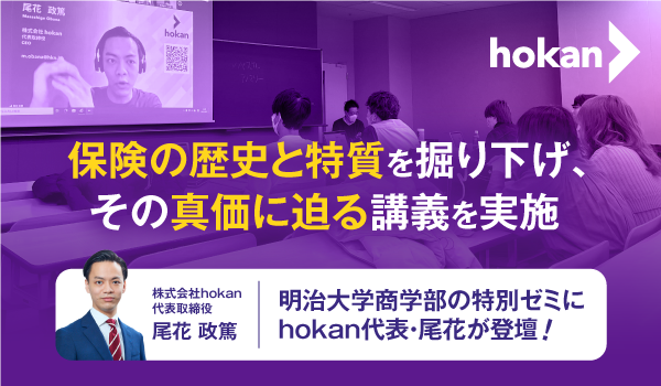 保険営業の業務を補完し、顧客情報を保管するクラウドサービス「hokan(R)」を提供する株式会社hokan(ホカン、本社:東京都千代田区)代表取締役CEO尾花政篤が明治大学商学部藤井陽一郎ゼミナールにおいて、講師として登壇しましたことをお知らせいたします。