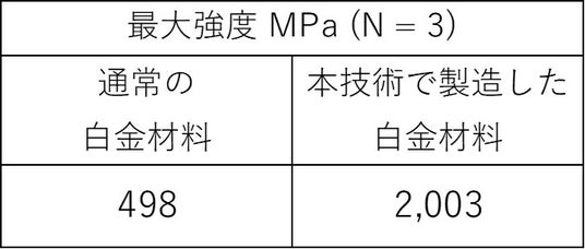 純度99.9%以上の純プラチナとして、世界最高のビッカース硬度500 HV以上と強度2,000 MPaを達成高い加工性により、幅広い産業への応用を期待