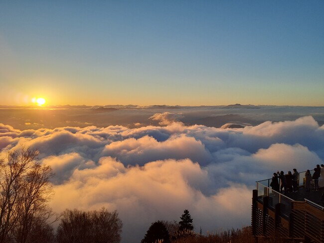 世界最大級ロープウェイに乗り、標高1,770mのSORA terraceからは、条件が合えば雲海やサンセットを眺めることができ、非日常空間を体験する事ができます。雲海は早朝に発生するイメージがありますが、竜王マウンテンリゾートでは夕方に雲海が発生する確率が最も高く、目の前の北アルプスに沈むオレンジ色に色づく夕日に照らされた雲海が見られるスポットとなります。