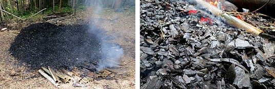 水源の確保: 炭が8割ほど燃えたら水をかけて消火します。炎の端から出てくる竹炭を回収し、保管します。