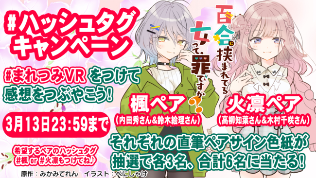 3月13日の23時59分までにハッシュタグ「#まれつみVR」をつけて感想をつぶやいていただいた方の中から、抽選で本作の神枝楓役、内田秀様と鈴木絵理様ペア、火凛役の高柳知葉様と木村千咲様ペアのそれぞれの直筆サイン色紙が各3名様、あわせて6名様に当たります。