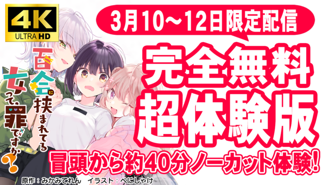 2月24日の配信開始以来、多くの皆様にご視聴いただいておりますバーチャルリーディング「百合に挟まれてる女って、罪ですか?」ですが、より多くの皆様に手軽にバーチャルリーディングを体験していただきたいと考え、今回の超体験版の配信決定に至りました。