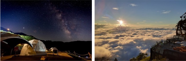 2021年にOPENした「SORA GLAMPING RESORT」では、スキー場の斜面を有効に活用し、エリアを段々畑状に造成することで、前方の区画から5m以上の高さがうまれ、各テント同士が景色を遮らないプライベート空間を演出しています。また、目の前には夕日が沈み、夜には満天の星が見られる非日常空間で思い出に残る旅を提供しています。標高1,770mの 「SORA terrace」 で雲海や夕陽を見るのがおすすめです。