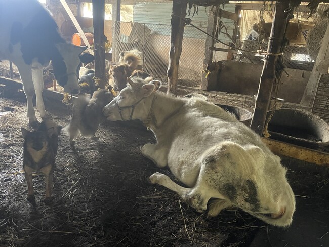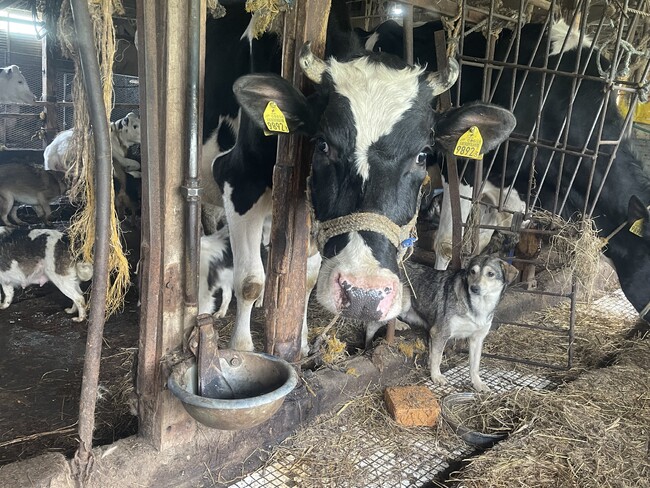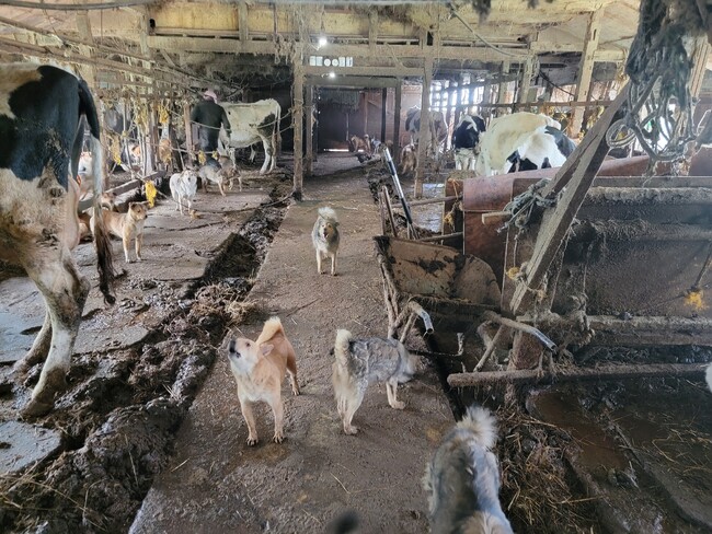視察を行った5月18日時点で、すでに行政職員とボランティアが救済活動で清掃とどうぶつの管理を行っていましたが、人員不足もあり糞尿で汚染された牛舎にストレスとエサ不足でやせ細った十数頭の乳牛と100頭近い犬が共に生かされていました。飼い主はこれまで搾乳による収入で犬の餌代を賄っていましたが、円安とインフレによる飼料の高騰、全国的な牛乳あまり、飼育環境の悪さによる搾乳量の減少などが重なり収入が激減し、多頭飼育崩壊に陥りました。