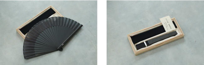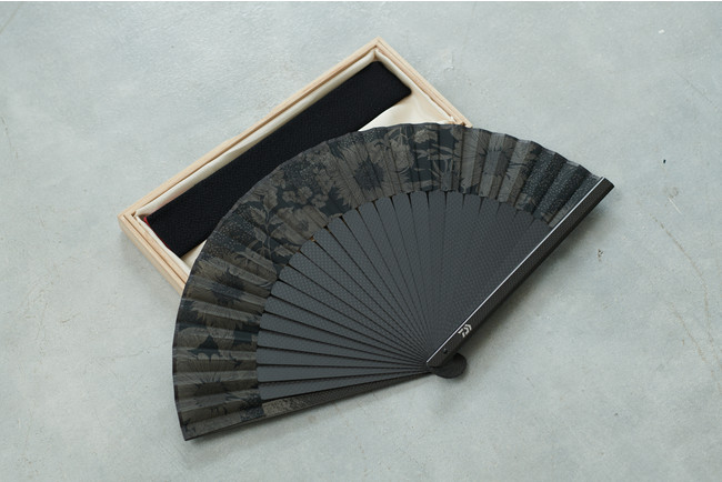 また、扇面には2つのデザインをご用意しました。伝統工芸に指定されている「江戸小紋」の極薄シルクと、英国王室御用達ロンドンの老舗百貨店・リバティ百貨店のリバティプリントが施されたコットン生地の2タイプ。どちらも黒基調で格式高いデザインに仕上げました。持ち運びにご活用いただけるちりめん加工を施した扇子入れとともに、桐箱に入れてご用意しています。
