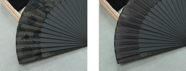 親骨・中骨のすべてにカーボンファイバーを使用し、ねじれや歪みのおこりにくい、長く使っていただける扇子を目指しました。特に、扇子の顔ともされる親骨には、高額な釣竿にも使用される高弾性のカーボンファイバーを使用。竹素材では困難な細身かつピンとした究極の「張り」を実現しました。
