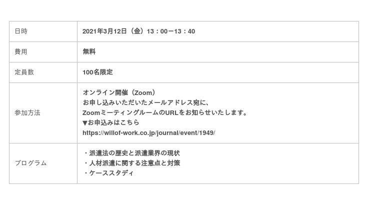 ウィルグループの人材サービスを主力とする株式会社ウィルオブ・ワーク(本社:東京都新宿区、代表取締役社長 告野 崇)は、2021年3月12日(金)に、『派遣社員のトリセツ!よくある派遣活用時のトラブル事例』と題した無料オンラインセミナーを開催します。本セミナーでは、派遣社員を採用するうえで必要となるコンプライアンス知識や実際に発生したケーススタディを交えながら派遣社員をうまく活用していく方法についてご紹介します。