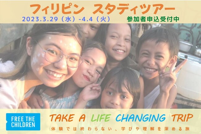 認定NPO法人フリー・ザ・チルドレン・ジャパン(所在地:東京都世田谷区南烏山6-6-5-3F、代表:中島早苗)は、当団体のフィリピン支援地域を訪れる中学生以上を対象とした1週間のスタディツアーを2023年3月に開催いたします(中学生未満は保護者の同行により参加可)。1999年より20年以上にわたり継続的な支援を行なっている当団体ならではのネットワークにより、先住民の村でのホームステイや、同国でも特に困難な生活を強いられている人々が暮らすスラム地域などを訪れ、現地の子どもたちとの交流を通して、世界の成り立ちや途上国における貧困の構造、支援の在り方について学び、考えます。2023年1月1月1日までの申込みで3000円の早割を実施。12月26日(月)19:00よりオンラインによる事前説明会を開催します。