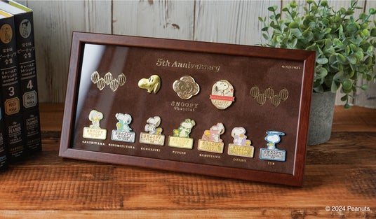 その各店舗で大人気のピンバッジに加え、5周年限定デザインのピンバッジをウッドフレームに集めた、特別なピンバッジコレクション。