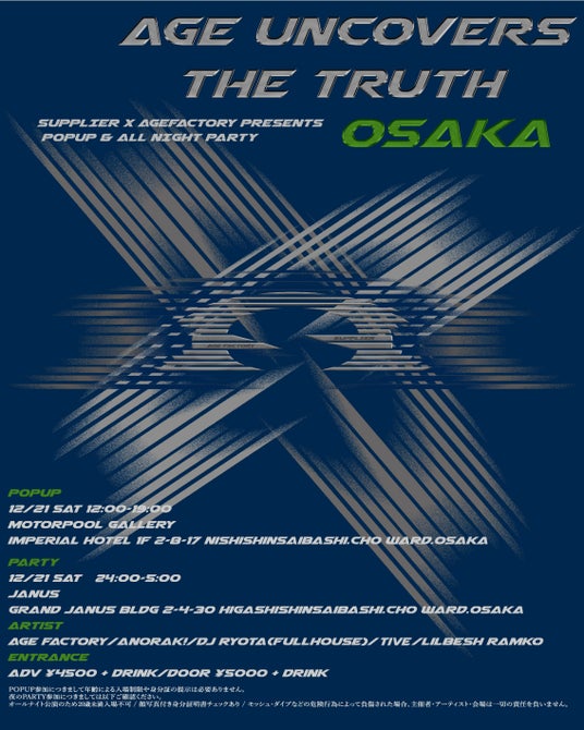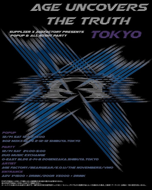 ストリートカルチャーカンパニー株式会社Plus Eighty One(本社:東京都渋谷区)の自社アパレルブランド「SUPPLIER (サプライヤー) 」は、ロックバンド「Age Factory(エイジファクトリー)」とコラボコレクション“AGE UNCOVERS THE TRUTH”を発売いたします。