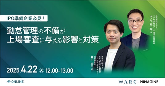 成長企業の経営管理支援事業を展開する株式会社WARC(本社: 東京都品川区、代表取締役社長: 山本 彰彦、以下「WARC」)は、「IPO準備企業必見!勤怠管理の不備が上場審査に与える影響と対策」と題し、オンラインセミナーを開催することをお知らせします。