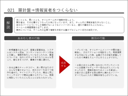 企業文化や行動指針の浸透・定着を目的に、弊社社員に向けた行動指針を定めています。「羅針盤」と名づけ、現在39項目ある指針のすべてに、良くない行動(あおむし君の行動)と、模範的な行動(揚羽の行動)という具体的なアウトプットを明記。そして、定期的に人事戦略に沿って修正・項目の追加を実施しています。