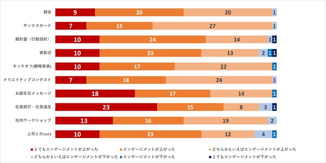 誕生日メッセージ、社員旅行・社員遠足などのイベントが上位に入っている結果から、「双方向のコミュニケーション」「部署を跨いだ交流」が社員同士の連携を高め、エンゲージメント向上につながっているという傾向がありそうです。