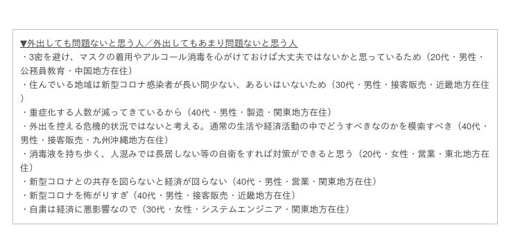 対象者に、現在、外出に対してどのような考えを持っているか聞いたこところ、「外出しても問題ないと思う」と回答した人が12.6%、「外出してもあまり問題ないと思う」と回答した人が33.5%、「あまり外出しないほうが良いと思う」と回答した人が49.1%、「外出するべきではないと思う」と回答する人が4.8%となりました。半数以上の人が外出に対して消極的な意向を示している一方で、「問題ない」と考えている人も46.1%いることから、外出することに対するハードルが下がってきているようすがうかがえます。また、外出を問題ないと考える理由については、「自分が生活している地域で新規感染者が連日発生していない」、「手洗いうがい、ソーシャルディスタンスの確保といった自衛ができていれば過度に自粛する必要はない」、「経済を活性化させなくてはならない」というような意見が目立ちました。外出をしないほうが良い、するべきではないと考える理由については、「自分や家族の感染を最大限避けるため」、「新型コロナに対するワクチンや治療法が確立されていないため」などの意見のほか、地方在住の人からも東京の感染者数増加の現状に外出を避けるべきとする意見が目立ちました。
