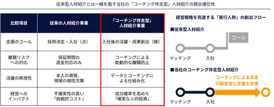 当社はこれまで、ビジネスコーチングを主軸とした人材開発事業を展開してまいりました。今後は本事業の開始により、採用から定着・活躍、成果まで伴走する統合ソリューションで、経営戦略と人事戦略をつなぐ『実行人財』を企業へご提供してまいります。