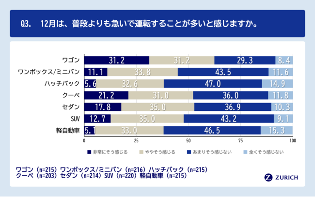 ■62.4%の「ワゴン」ドライバーが「12月は急いで運転することが多い」と実感、「軽自動車」比24.1ポイント高