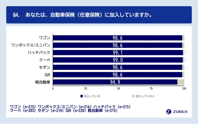 「Q4.あなたは、自動車保険(任意保険)に加入していますか。」と質問したところ、ワゴン(n=215)は「加入している」が98.6%、「加入していない」が1.4%、ワンボックス/ミニバン(n=216)は「加入している」が98.6%、「加入していない」が1.4%、ハッチバック(n=215)は「加入している」が99.1%、「加入していない」が0.9%、クーペ(n=203)は「加入している」が99.0%、「加入していない」が1.0%、セダン(n=214)は「加入している」が98.6%、「加入していない」が1.4%、SUV(n=220)は「加入している」が98.6%、「加入していない」が1.4%、軽自動車(n=215)は「加入している」が94.9%、「加入していない」が5.1%という回答となりました。