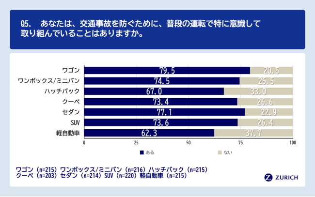 「Q5.あなたは、交通事故を防ぐために、普段の運転で特に意識して取り組んでいることはありますか。」と質問したところ、ワゴン(n=215)は「ある」が79.5%、「ない」が20.5%、ワンボックス/ミニバン(n=216)は「ある」が74.5%、「ない」が25.5%、ハッチバック(n=215)は「ある」が67.0%、「ない」が33.0%、クーペ(n=203)は「ある」が73.4%、「ない」が26.6%、セダン(n=214)は「ある」が77.1%、「ない」が22.9%、SUV(n=220)は「ある」が73.6%、「ない」が26.4%、軽自動車(n=215)は「ある」が62.3%、「ない」が37.7%という回答となりました。