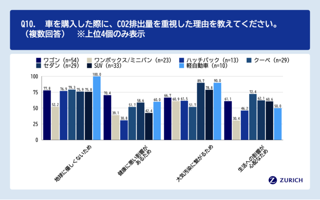 Q8で「CO2排出量」と回答した方に、「Q10.車を購入した際に、CO2排出量を重視した理由を教えてください。(複数回答)」と質問したところ、ワゴン(n=54)は「地球に優しくないため」が77.8%、「健康に悪い影響があるため」が70.4%、ワンボックス/ミニバン(n=23)は「大気汚染に繋がるため」が60.9%、「地球に優しくないため」が52.2%、ハッチバック(n=13)は「地球に優しくないため」が76.9%、「大気汚染に繋がるため」が61.5%、クーペ(n=29)は「地球に優しくないため」が79.3%、「生活への影響が心配なため」が72.4%、セダン(n=29)は「大気汚染に繋がるため」が89.7%、「地球に優しくないため」が75.9%、SUV(n=33)は「大気汚染に繋がるため」が78.8%、「地球に優しくないため」が75.8%、軽自動車(n=10)は「地球に優しくないため」が100.0%、「大気汚染に繋がるため」が90.0%という回答となりました。
