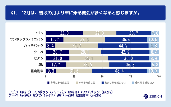 「Q1.12月は、普段の月より車に乗る機会が多くなると感じますか。」と質問したところ、ワゴン(n=215)は「非常にそう感じる」が33.0%、「ややそう感じる」が29.3%、ワンボックス/ミニバン(n=216)は「非常にそう感じる」が15.7%、「ややそう感じる」が37.0%、ハッチバック(n=215)は「非常にそう感じる」が8.4%、「ややそう感じる」が37.7%、クーペ(n=203)は「非常にそう感じる」が20.7%、「ややそう感じる」が28.1%、セダン(n=214)は「非常にそう感じる」が21.0%、「ややそう感じる」が34.1%、SUV(n=220)は「非常にそう感じる」が17.7%、「ややそう感じる」が38.6%、軽自動車(n=215)は「非常にそう感じる」が9.3%、「ややそう感じる」が31.6%という回答となりました。