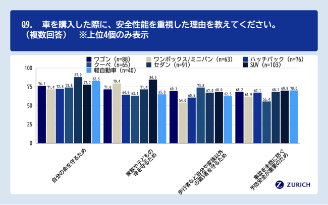 Q8で「安全性能」と回答した方に、「Q9.車を購入した際に、安全性能を重視した理由を教えてください。(複数回答)」と質問したところ、ワゴン(n=88)は「自分の命を守るため」が76.1%、「家族や子どもの命を守るため」が71.6%、ワンボックス/ミニバン(n=63)は「家族や子どもの命を守るため」が79.4%、「自分の命を守るため」が71.4%、ハッチバック(n=76)は「自分の命を守るため」が72.4%、「事故を未然に防ぐ予防安全が重要のため」が67.1%、クーペ(n=65)は「自分の命を守るため」が73.8%、「歩行者など自分や家族以外の第3者を守るため」が73.8%、セダン(n=91)は「自分の命を守るため」が87.9%、「家族や子どもの命を守るため」が71.4%、SUV(n=103)は「家族や子どもの命を守るため」が84.5%、「自分の命を守るため」が77.7%、軽自動車(n=40)は「自分の命を守るため」が82.5%、「事故を未然に防ぐ予防安全が重要のため」が70.0%という回答となりました。