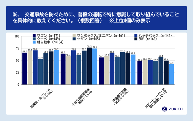 Q5で「ある」と回答した方に、「Q6.交通事故を防ぐために、普段の運転で特に意識して取り組んでいることを具体的に教えてください。(複数回答)」と質問したところ、ワゴン(n=171)は「急発進・急ブレーキをしない」が66.1%、「十分な車間距離を確保している」が63.7%、ワンボックス/ミニバン(n=161)は「急発進・急ブレーキをしない」が69.6%、「不必要な加速・減速をしない」が59.0%、ハッチバック(n=144)は「急発進・急ブレーキをしない」が70.8%、「十分な車間距離を確保している」が70.8%、クーペ(n=149)は「十分な車間距離を確保している」が61.1%、「不必要な加速・減速をしない」が56.4%、セダン(n=165)は「十分な車間距離を確保している」が70.3%、「不必要な加速・減速をしない」が67.3%、SUV(n=162)は、「十分な車間距離を確保している」が76.5%、「急発進・急ブレーキをしない」が68.5%、軽自動車(n=134)は「十分な車間距離を確保している」が74.6%、「急発進・急ブレーキをしない」が70.9%という回答となりました。