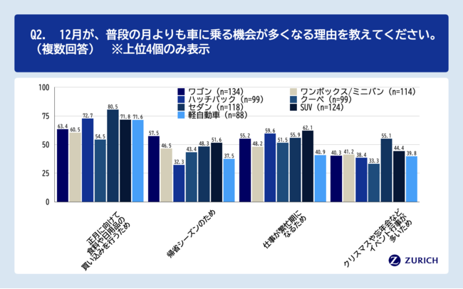 Q1で「非常に感じる」「ややそう感じる」と回答した方に、「Q2.12月が、普段の月よりも車に乗る機会が多くなる理由を教えてください。(複数回答)」と質問したところ、ワゴン(n=134)は「正月に向けて食料や日用品の買い込みを行うため」が63.4%、「帰省シーズンのため」が57.5%、ワンボックス/ミニバン(n=114)は「正月に向けて食料や日用品の買い込みを行うため」が60.5%、「仕事が繁忙期になるため」が48.2%、ハッチバック(n=99)は「正月に向けて食料や日用品の買い込みを行うため」が72.7%、「仕事が繁忙期になるため」が59.6%、クーペ(n=99)は「正月に向けて食料や日用品の買い込みを行うため」が54.5%、「仕事が繁忙期になるため」が51.5%、セダン(n=118)は「正月に向けて食料や日用品の買い込みを行うため」が80.5%、「仕事が繁忙期になるため」が55.9%、SUV(n=124)は「正月に向けて食料や日用品の買い込みを行うため」が71.8%、「仕事が繁忙期になるため」が62.1%、軽自動車(n=88)は「正月に向けて食料や日用品の買い込みを行うため」が71.6%、「仕事が繁忙期になるため」が40.9%という回答となりました。