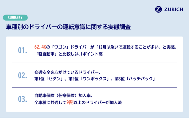 チューリッヒ保険会社(東京都中野区、日本における代表者および最高経営責任者:西浦正親)は、『車種別のドライバーの運転意識に関する実態調査』を実施しましたので、お知らせします。交通事故は近年減少傾向にあり、ドライバーの交通安全への意識は高まっているものの、12月の交通事故件数は少ない月に比べ約1.25倍まで増加します。そこで、「ワゴン」「ワンボックス/ミニバン」「ハッチバック」「クーペ」「セダン」「SUV」「軽自動車」を所有し、頻繁に運転している方に対して運転意識に関する実態を調査しました。