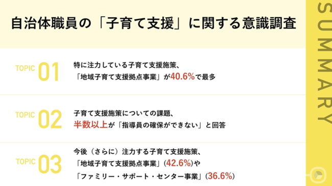 子育て支援施策についての課題については、「指導員の確保ができない」(50.5%)、「指導員の待遇の改善が難しい」(44.6%)が上位となりました。また、75.2%が、母子保健と児童福祉の連携を行いつつも、約8割が双方の連携に課題を感じていることが明らかとなり、「シームレスな支援が難しい」や「職務を行う場所が離れていて、即時に情報交換がしにくい」などの課題の声が寄せられました。今後(さらに)注力する意向のある子育て支援施策については、「地域子育て支援拠点事業」(42.6%)、「ファミリー・サポート・センター事業」(36.6%)が上位となり、他にも「一人親支援」や「見守る目の充実」などが挙げられました。