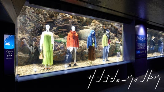 「サンゴショーウィンドウ」は、世界最大級の水族館「海遊館」(大阪市港区)で2023年5月12日~14日の3日間限定で開催された特別企画です。舞台は館内で5番目に大きなサンゴ礁水槽「グレート・バリア・リーフ」水槽。リニューアル工事のため魚を移動させ、水が抜かれた“空の水槽”の巨大なガラス面を「ショーウィンドウ」に見立て、海洋プラスチックごみや漁網などの素材をリサイクルして作られた環境にやさしいアイテムを、3つのサステナブルファッションブランドとのコラボレーションで展示しました。