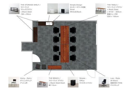 中央のデスクは幅220cmの大型デスクを2台繋げることで幅440cmの長さとなり、メンバーが集まって仕事をする場所となっています。また、全てのアイテムの脚部はブラックアイアンで統一し、チェアやキャビネット等も黒を取り入れてダークなトーンを作り上げています。