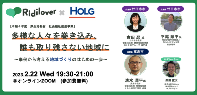 また、令和5年2月22日には、重層事業や地域づくり・地域共生の分野についてご関心のある市町村の公務員の方・事業者の方を主な対象に、公務員オンラインサロンを運営する株式会社ホルグと共催で、本手引きの紹介と「地域づくり」の事例紹介を中心としたオンラインイベントを開催いたします。