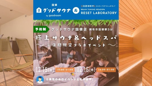 gooddaysホールディングス株式会社(代表取締役社長:小倉博)の子会社グッドルーム株式会社(代表取締役社長:小倉弘之、以下「グッドルーム」)が展開する「グッドサウナ調布国領」において、株式会社マフモが運営するRESET LABORATORY(リセラボ)との初のコラボレーションイベント「グッドサウナ調布国領 × RESET LABORATORY ととのい体験」を開催いたします。本イベントは2024年12月15日(日)および12月16日(月)の13:00~21:00に実施され、男性限定での開催となります。