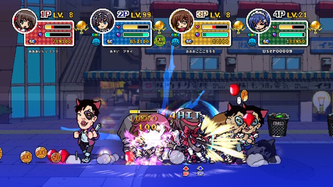 『ファントムブレイカー:バトルグラウンド オーバードライブ』は、ピクセルアートで描かれたビジュアルやサウンドで好評の横スクロールラインバトルアクションゲームです。レトロ風でありながら、現在のゲーム機の性能を活かし、多数の敵が登場して大乱戦を楽しめ、多人数同時プレイも可能となっています。また、他機種版ではDLCとして追加されたキャラクターも初期状態からプレイ可能となっています。