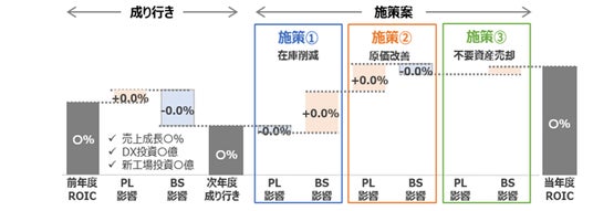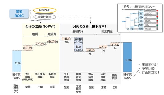 これにより実績の振り返り時において、ROICの変動要因を明確にし、改善が進んでいる(または遅れている)事業や部署・勘定科目の明確化や施策別の評価を行うことが可能となり、次への改善方針へと繋げることが可能です。さらに計画策定においては、施策別・投資別にROICへの影響を可視化することで、効果的な施策の選定や、避けられないROIC低下の影響を明確にすることができます。