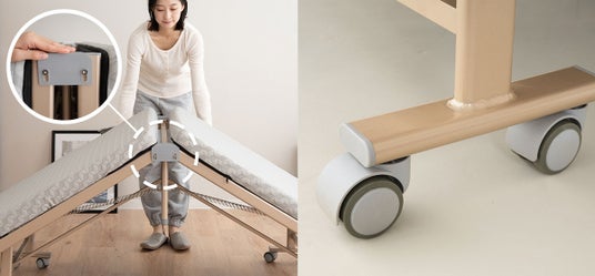 ベッドを開く際に、指をはさむリスクを軽減する指はさみ防止パーツ付きで、安全に開くことができます。また、寝転んだ際に自動的にブレーキがかかり、寝返りなどで動いたり揺れたりしない安定度の高いキャスターを採用しています。キャスターを手動でロックする手間は不要です。