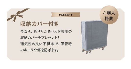 1年間の製品保証付きのため、安心してお使いいただけます。また、今なら、収納時に便利な折りたたみベッド専用のカバーをお付けします。