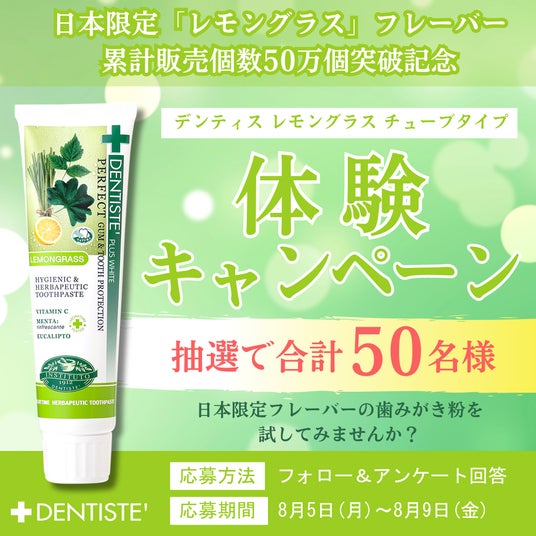 「デンティス レモングラス チューブタイプ」の累計販売個数50万個突破を記念して、レモングラス チューブタイプをお試しいただき、SNSに感想をご投稿いただける方を50名募集いたします。
