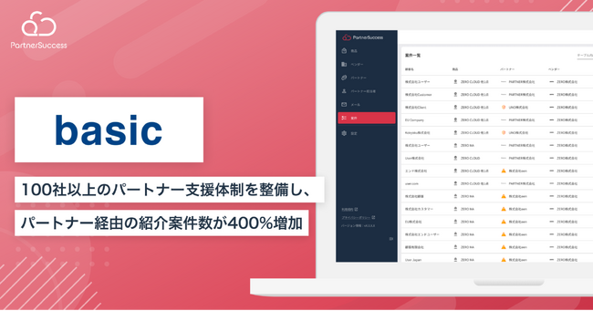 代理店販売で業績を伸ばすPRM(※1)-代理店連携管理クラウド「PartnerSuccess」を開発運営するパートナーサクセス株式会社(本社:東京都渋谷区、代表取締役 永田雅裕、以下「パートナーサクセス」)は、株式会社ベーシック(本社:東京都千代田区、代表取締役 秋山 勝、以下「ベーシック」)に「代理店戦略支援コンサルティングサービス」と「PartnerSuccess」を導入頂きました。