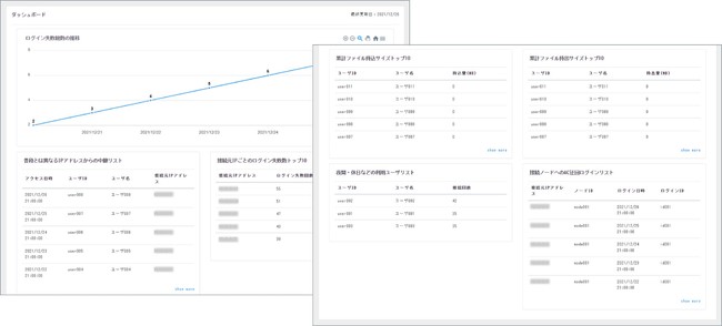 具体的には、一定期間に利用実績のないユーザや、普段とは異なる接続元からのアクセスログ、本製品を経由せずに(迂回して)アクセスしたログ、夜間休日にアクセスしたログなどを、ダッシュボードの一覧で確認することができ、これまで個別にデータを加工・分析していた監査業務の工数削減が期待できます。