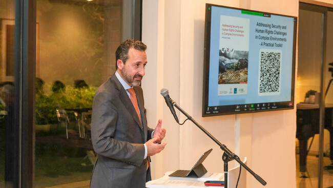 邦訳版の発行に伴い、6月14日、アンドレアス・バオム駐日スイス大使公邸で発行記念イベントを開催しました。バオム大使は開会の挨拶で、「紛争地域のような複雑なセキュリティ環境下では、企業が民間人の安全と福祉に、良くも悪くも大きな影響を与える可能性があります」と指摘。続いて、基調講演を行ったICRCのロバート・マルディーニ事務局長も、「企業が慎重でなければ、地域住民が傷つけられ、脅迫され、家を失い、生計を失うなどの被害が生じます。多くの場合、企業が故意にそう仕向けたり、直接的な加害者となることはありません。実際に被害を与えるとしたら、企業を支援したり代行したりする治安部隊や民間警備提供者、政府機関、政治や宗教の指導者などです。そうした被害が起きてしまうと、不平不満が沸き上がり、新たな紛争や暴力事態の火種となり、さらには人道上の犠牲も伴います」と訴えました。その上で、紛争地で一世紀半以上にわたり活動してきたICRCだからこそ、企業に対してそうした環境下でいかに対応すべきかを自らの知見に基づいて示し、それにより弱い立場に置かれたコミュニティを保護しながら、さらなる被害を防ぐことに貢献できる、との考えを示しました。