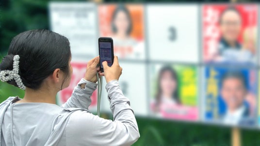 まず「MARRIAGE VISION」のサイト(https://marriage-vision.com/)にアクセス。次に、表示されている選挙区の中から、利用者がかざそうとしているポスターの選挙区を選択すると、スマートフォンのカメラが自動で起動します。あとはスマートフォンのカメラを、選挙ポスターにかざすだけです。