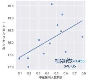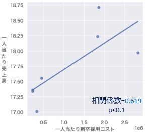 - 1人当たり新卒採用コスト(相関係数=0.619, p値<0.1)および中途採用人数割合(相関係数=0.455, p値<0.05)も、売上高とプラスの関係にあります。