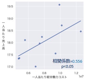- 従業員1人当たり売上高は、総労働力コスト(相関係数=0.556, p値<0.05)と正の相関が示され、「人件費削減が利益向上につながる」という従来の考え方を覆す結果となりました。