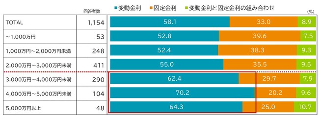 また、「金利形態」と「借入金額(当初設定額)」のクロス分析を行ったところ、住宅ローンを現在利用中している人(1,154人)について、全体の変動金利の利用率と借入金額区分別の利用率とを比較してみると「借入金額3,000万円」を境に変動金利の利用率が上昇していることが確認できました。具体的には、「借入金額区分2,000万円~3,000万円未満 ⇒ 変動金利利用率は55.0%」であるのが、より大きな金額区分の変動金利の利用率は順に62.4%、70.2%、64.3%と「6割から7割」に上昇しています【図表3】。