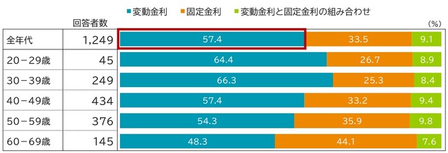 年代別に変動金利の利用率を見ていくと、20代で64.4%、30代で66.3%となっており、若年層で利用率が高くなっていることがうかがえる結果となっています。