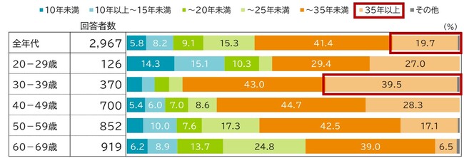 「返済期間」については、全年代では「25年以上~35年未満」が約4割、「35年以上」は約2割、という結果でしたが、30代に注目すると「25年以上~35年未満」が4割という点は全年代と変わらないものの、「35年以上」も4割(39.5%)を占めており、この比率は全年代平均の2倍となっていることがわかりました【図表1】。